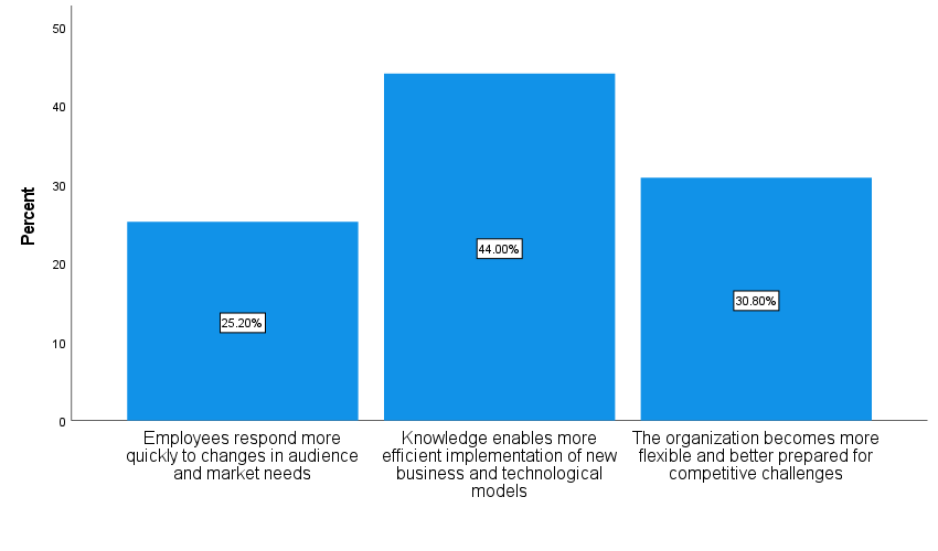 Ispitanici su tvrdnju „Medijske organizacije koje ulažu u znanje lakše se prilagođavaju tržišnim promenama“ ocenili veoma visokom prosečnom ocenom 6,06, uz medijanu 6 i mod 7. Varijabla je pokazala izraženu negativnu asimetriju (Skewness = –1,521) i relativno malu varijabilnost (CV = 19,75%). Ovaj stav je takođe bio konzistentan u svim posmatranim kategorijama. Najčešći razlozi bili su „Znanje omogućava efikasniju primenu novih poslovnih i tehnoloških modela“ (44%), „Organizacija postaje fleksibilnija i spremnija za konkurentske izazove“ (30,8%) i „Zaposleni brže reaguju na promene u potrebama publike i tržišta“ (25,2%).