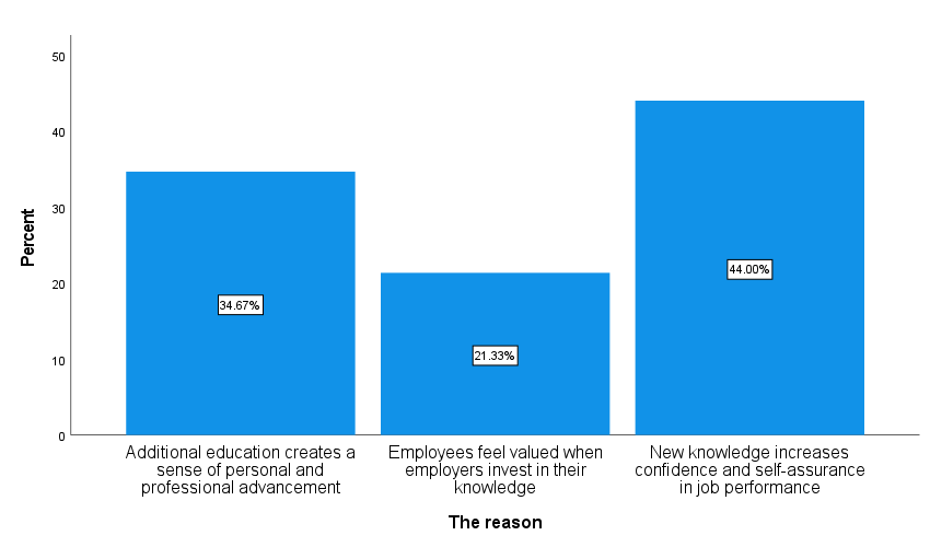Ispitanici su tvrdnju „Kontinuirano obrazovanje povećava motivaciju zaposlenih“ ocenili prosečnom ocenom 5,62, medijanom 6 i modom 6. Prvi kvartil (Q1) iznosio je 5, što znači da je 25% ispitanika dalo ocenu 5 ili manju, dok je treći kvartil (Q3) iznosio 7. Varijabla je pokazala relativno malu varijabilnost (CV = 26,71%) i izraženu negativnu asimetriju (Skewness = –1,102). Ovaj stav je bio konzistentan u odnosu na pol, nivo obrazovanja, poziciju u organizaciji, sektor zaposlenja i godine radnog iskustva. Među ispitanicima koji su dali ocenu 5 ili više, najčešće navedeni razlog bio je „Novo znanje povećava samopouzdanje u obavljanju posla“ (44%), zatim „Dodatno obrazovanje stvara osećaj ličnog i profesionalnog napretka“ (34,67%) i „Zaposleni se osećaju vrednovanim kada poslodavac ulaže u njihovo znanje“ (21,3%).